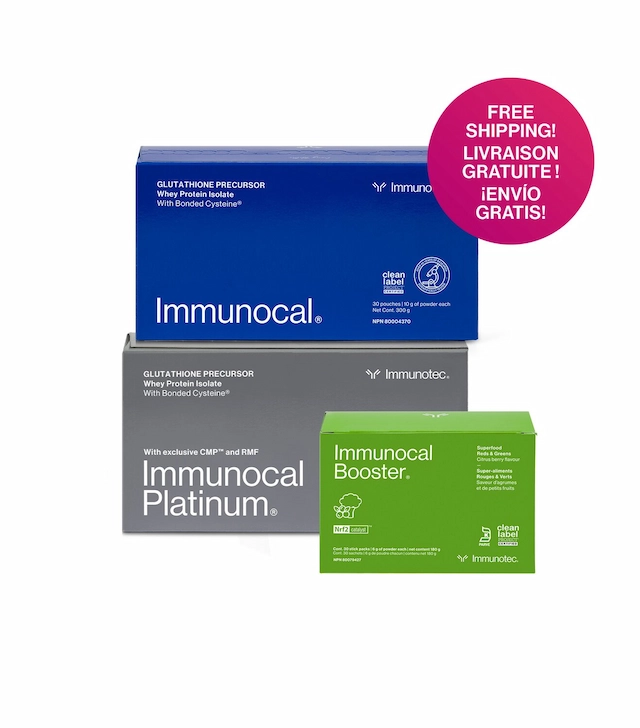 One box Immunocal® — 30 pouches, 30-day supply. One box Immunocal Platinum® — 30 pouches, 30-day supply. One box Immunocal Booster® — 30 stick packs, 30-day supply. All fat-free, sugar-free. Available worldwide with global shipping.