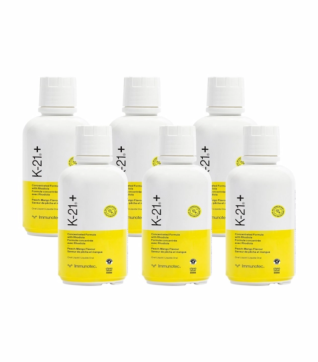 Everything that makes K-21 Plus Rhodiola Adaptogen one of the most comprehensive adaptogenic formulas available — the 21-component herbal and mineral blend, the Rhodiola rosea root, the four-mineral complex, the Mango-Peach flavor — now available in a six-bottle value bundle that covers six full months of daily use at the best possible price per serving.