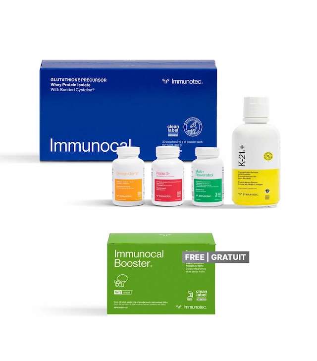 One box Immunocal® — 30 pouches. One box Immunocal Booster® — 30 stick packs. One box Probio 3+ With Cranberry — 30 capsules. One box Multi+ Resveratrol — 60 capsules, 30-day supply. One bottle Omega Gen V — 120 softgels, 30-day supply. One bottle K-21+ Sugar Free — 30-day supply. All six products provide a coordinated 30-day Optimal Immunity Support protocol. Available worldwide with global shipping.